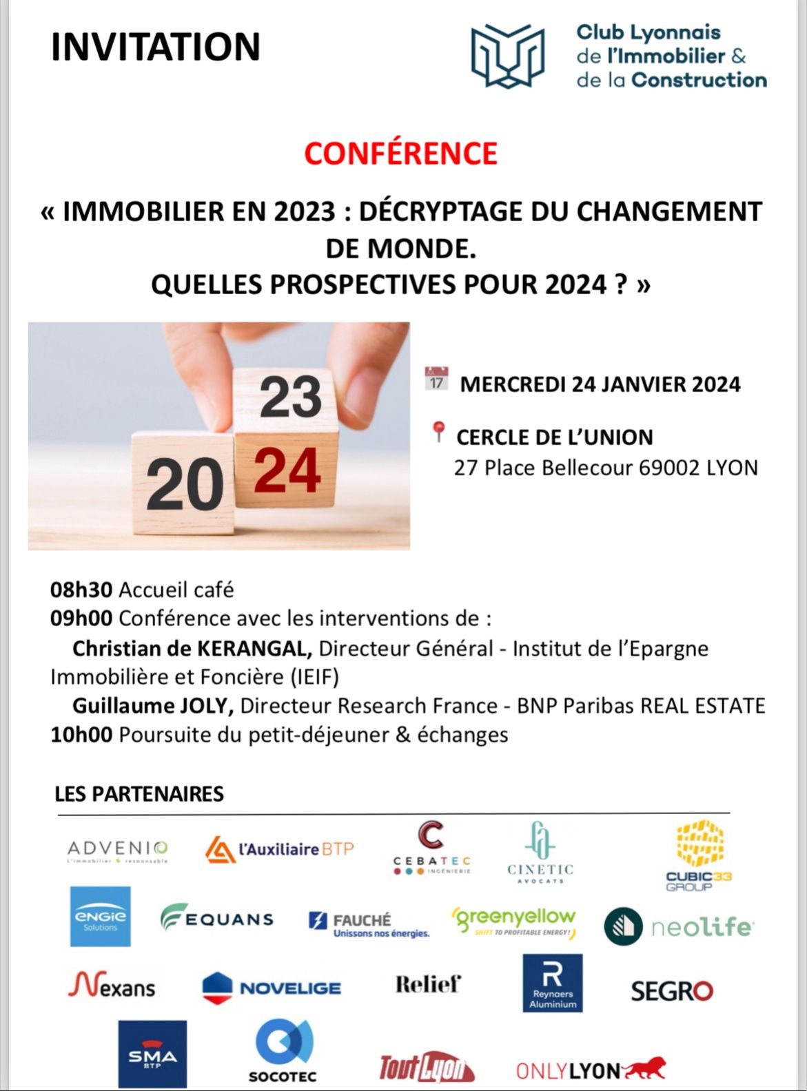 À l’aube de cette nouvelle année 2024, le Club Lyonnais de l'Immobilier et de la Construction CLIC vous présente ses meilleurs vœux et est heureux de convier ses Membres & Partenaires à un petit-déjeuner conférence de rentrée sur les perspectives 2024 du secteur immobilier.